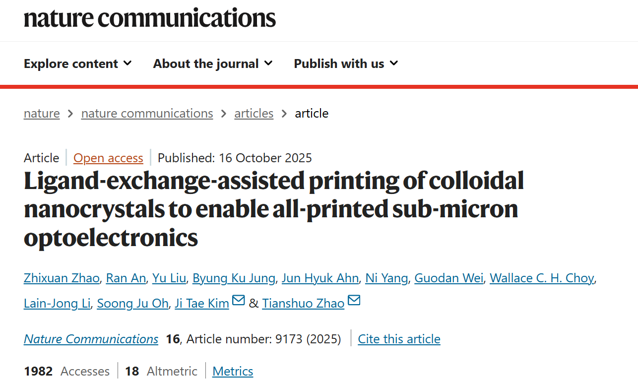 研究成果以“配体交换辅助胶体纳米晶体打印实现全打印亚微米光电子器件/Ligand-exchange-assistedprinting