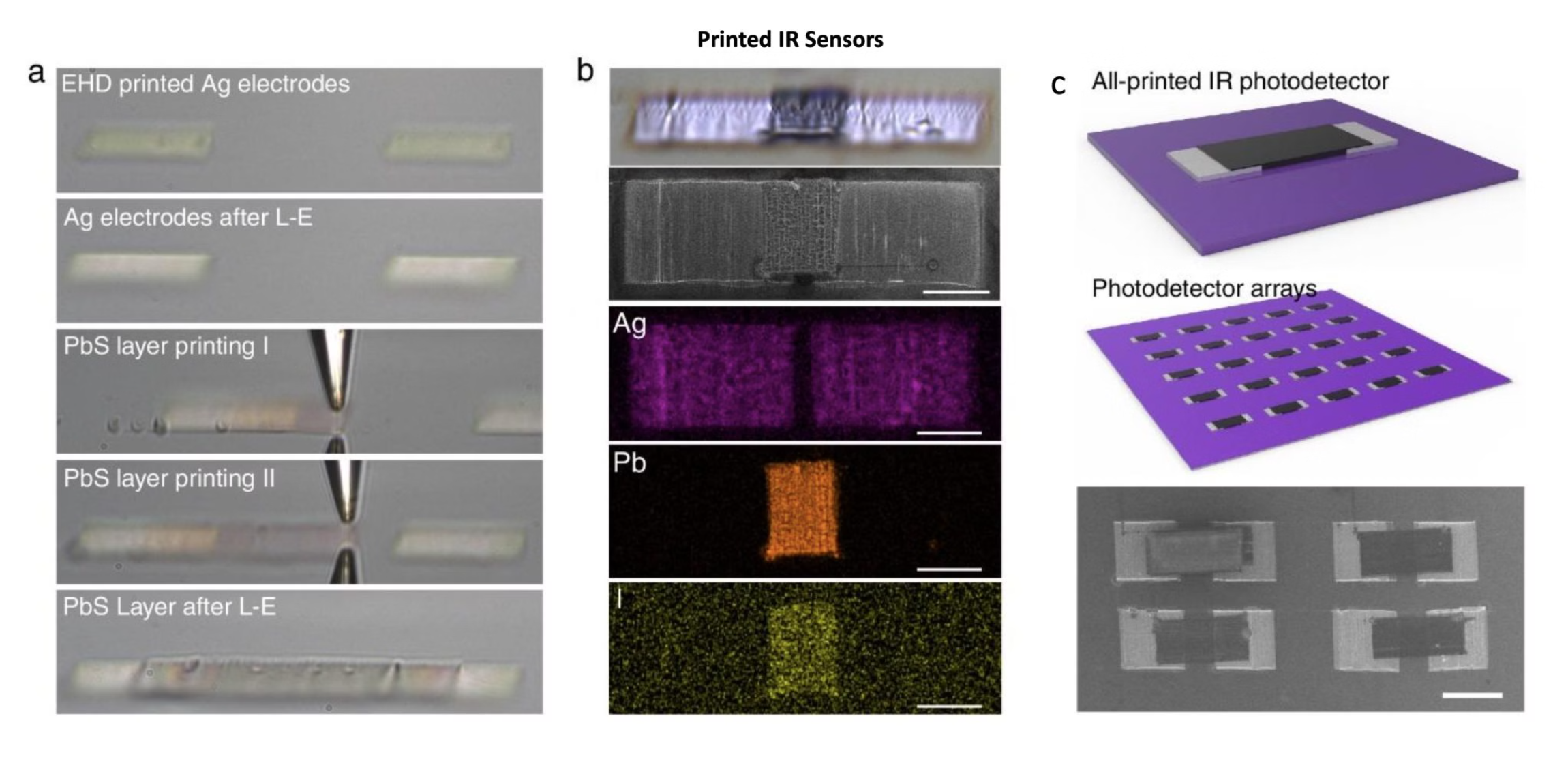 △(a)红外传感器的3D打印。(b)构成红外传感器的电极和光敏层的室温打印工艺。打印出的红外微传感器的结构和化学成分。(c)打印出的红外传感器微像素阵列。