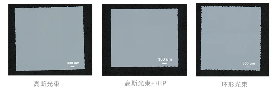 环形光束打印成形的钛合金结构件,其致密度与孔洞尺寸已达到与热等静压(HIP)后处理工艺相当的水平,且显微组织结构未出现显著差异,表明该技术可在不依赖HIP工序的情况下直接实现近全致密的高质量成形。