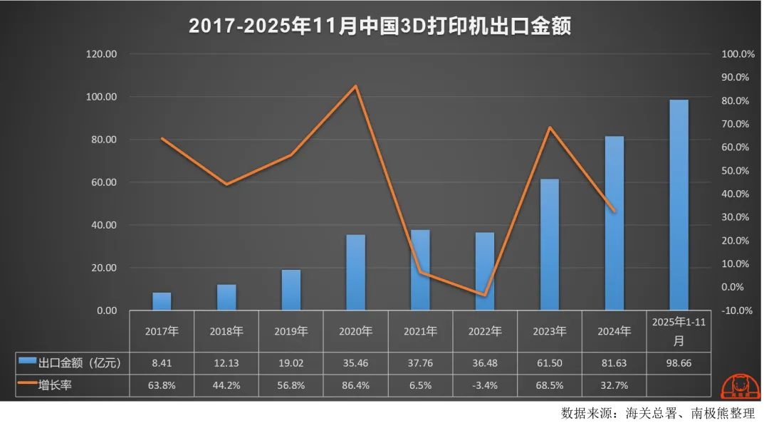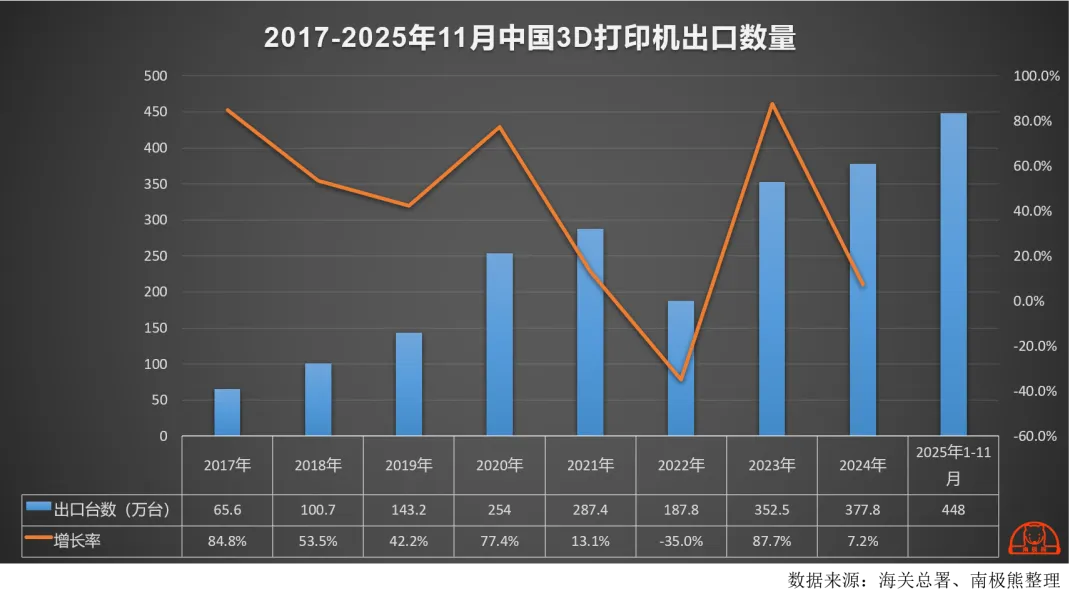 出口方面,海关总署数据显示,2025年1-11月我国累计出口3D打印机448万台,同比增长29.6%,其中99%以上为桌面级产品,中国已稳固占据全球桌面3D打印机市场超九成份额。