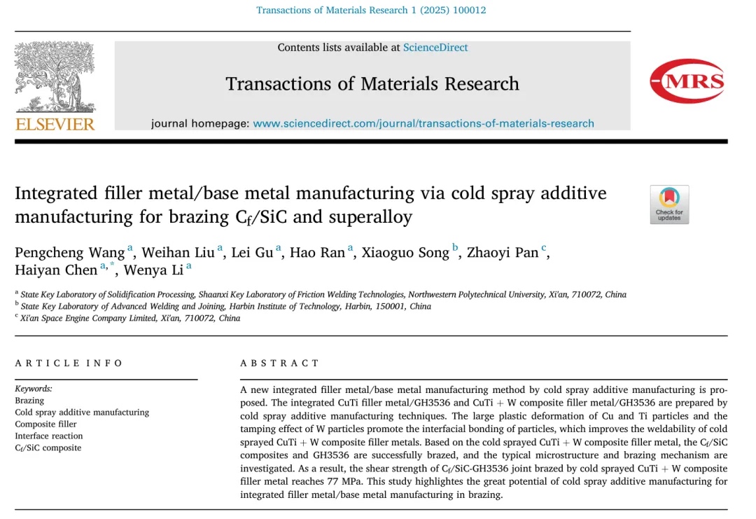 研究表明,冷喷涂CuTi+W复合钎料钎焊Cf/SiC-GH3536接头的剪切强度达到77MPa。这项研究,突出了在钎焊中,冷喷涂增材制造集成钎料/母材制造的巨大潜力。