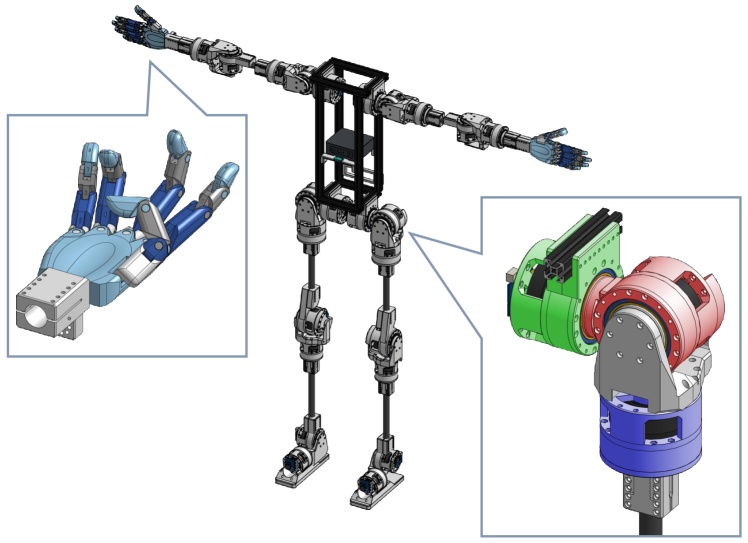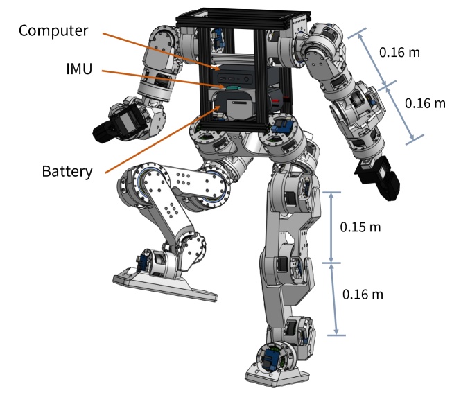 打印的摆线齿轮箱,直接驱动腿部和手臂中的关节。躯干采用铝挤压件制成,以支持安装其他组件,手机级 IMU 位于躯干中心附近。