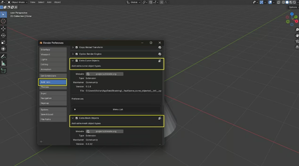 或者,如果您的Blender版本从4.1开始,则无需执行这些步骤,因为附加组件现在是设置的一部分。不过,您必须通过转到“编辑>首选项>附加组件”,然后选中“添加曲线:额外对象”和“添加网格:额外对象”来启用它们。