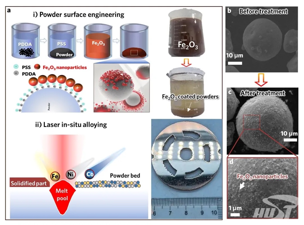 研究团队经过长期深入研究,在软磁无序合金成分设计、粉体表面改性技术、增材制造工艺优化、微观组织结构的演变规律及其对磁学性能的影响机制等方面进行了全面探索,提出了一种创新的增材制造过程中原位物相调控策略。该策略基于纳米氧化物表面改性的元素粉末,在激光增材制造过程中原位调控物相结构(BCC/FCC双相变FCC单相),实现了软磁性能的优化,从而有效解决了当前增材制造软磁多组元合金在性能上的不足。
