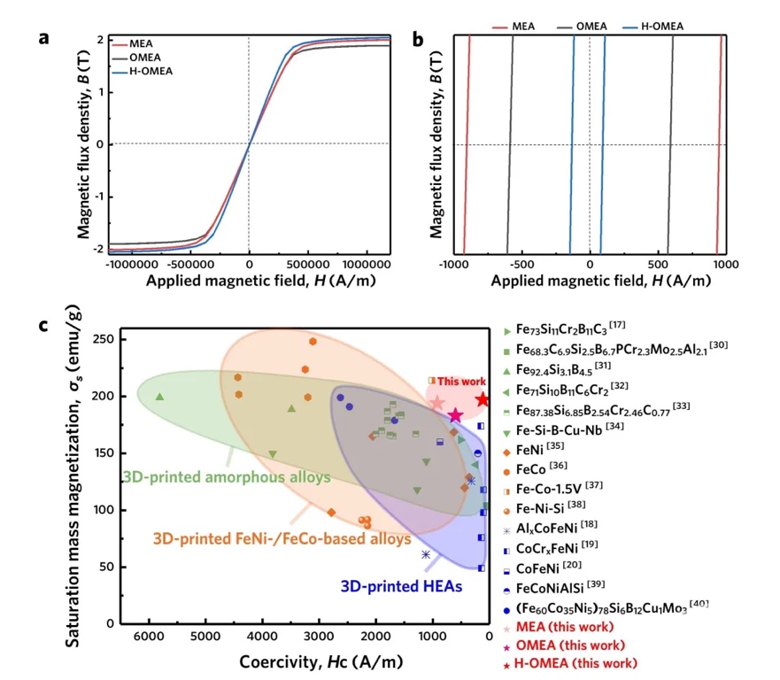 软磁合金是一种重要的功能材料,在现代科学技术和工业发展中,特别是在电力、电子和能源领域,发挥着关键作用。随着科技的快速进步,新一代电气设备对软磁材料的性能提出了更高的要求。近年来,具有优异软磁性能的多组元合金受到了广泛关注,展现出替代传统软磁合金的潜力。然而,由于多组元合金成形性较差,传统成形技术在制造复杂形状的软磁多组元合金时面临巨大挑战。增材制造(又称为3D打印)是一种基于逐层堆叠的新型加工方法,可实现复杂形状软磁材料与构件的成形制造。然而,现有文献报道的增材制造软磁多组元合金往往难以同时满足高饱和磁感应强度、低矫顽力和低损耗等性能要求。