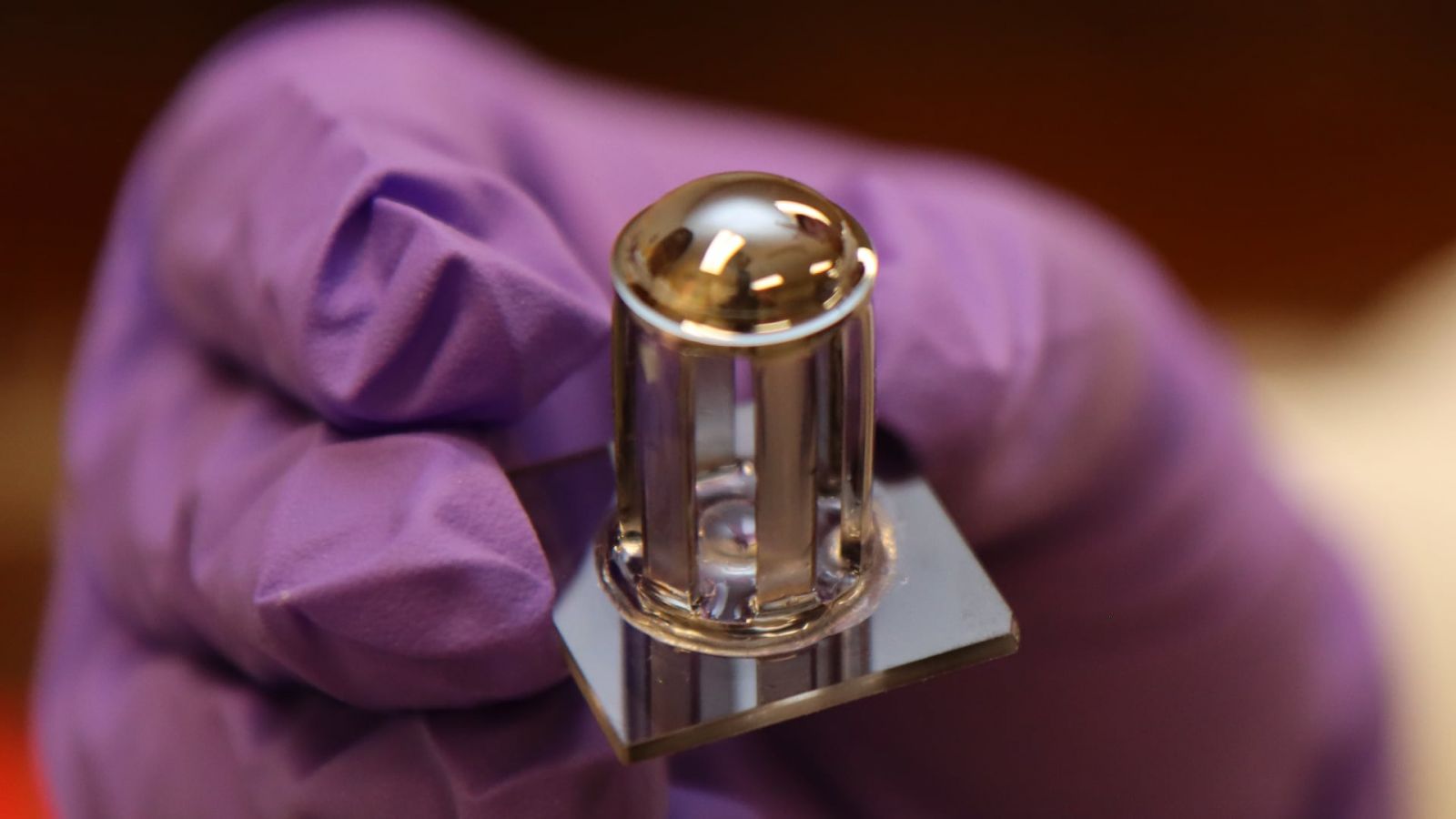 △普渡大学增材和智能制造实验室使用 Huachao Mao 的 3D 打印创新技术打印出一个小型、复杂的光学镜头。照片来源:普渡大学/John O'Malley。