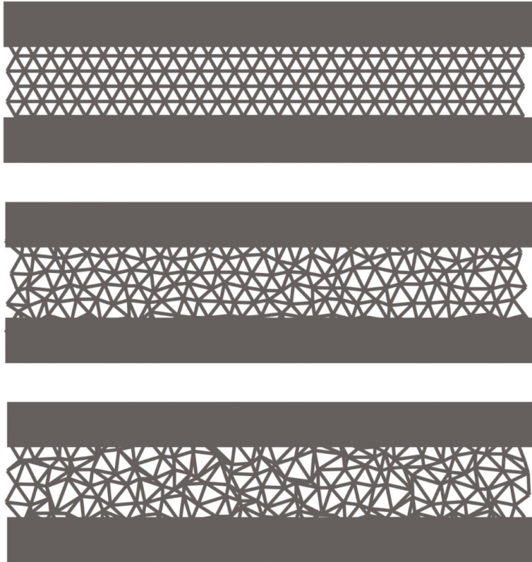 大自然常常利用结构无序性来提升材料的耐久性,例如在骨头、珍珠层(即贝壳内壁的彩虹层)以及贻贝足丝中都能找到这种策略。受这些生物材料的启发,宾夕法尼亚大学的研究人员对3D打印机械超材料中的无序结构进行了深入测试。他们从标准的三角形晶格结构出发,通过系统地调整三角形节点的交点位置,探索了不同程度的无序性对材料性能的影响。