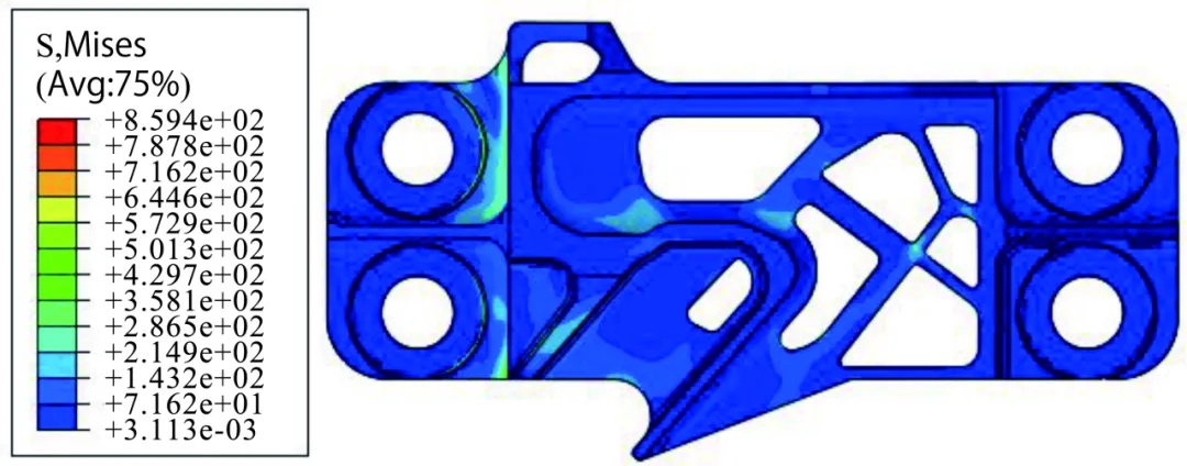 经过有限元分析,得到负压工况和止动块破损工况下的Mises应力云图(图7、图8),可知两种工况下应力最大位置在螺栓孔附近的R区,且均未超钛合金材料许用强度,拓扑优化结构区域在止动块破损工况下应力水平相对较高。同时得到位移云图(图9、图10),显示结构最大位移出现在加载位置附近,两种工况下变形均较小,整体刚度较好。