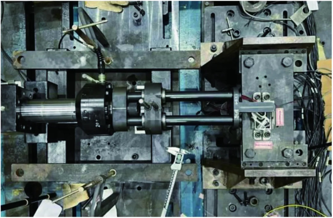 选择止动块破损工况的载荷作为试验载荷,因其应力较大且对拓扑优化区域强度考核明显。试验采用钢质平板底座和圆柱加载头模拟实际工况,底座通过螺栓与试验件连接,加载头几何外形与实际滚轮一致(图11),液压作动器通过加载头加载(图12)。