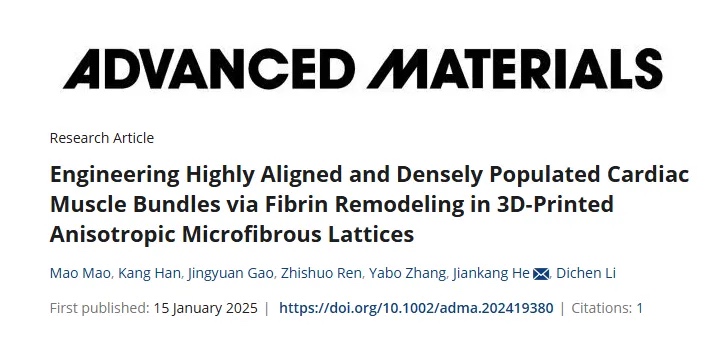 本研究开发了一种各向异性的3D打印微纤维晶格,这是心脏组织工程领域的一项重大进展。该平台将精确的结构控制与仿生纤维蛋白水凝胶重塑相结合,成功构建出高度有序、密集的心肌束,这些心肌束具有增强的电生理和机械性能。晶格的纵向互连孔隙不仅有助于高密度细胞组织和强大的互连性,还支持血管化和功能性组织成熟等关键过程。这些研究结果证明了微纤维晶格作为一种可扩展且有效的工具,在构建生理相关心脏组织方面的多功能性。展望未来,该方法在疾病建模、药物筛选和再生治疗等应用中具有巨大潜力,特别是在满足高密度细胞排列、同步收缩和长期组织存活的关键需求方面。