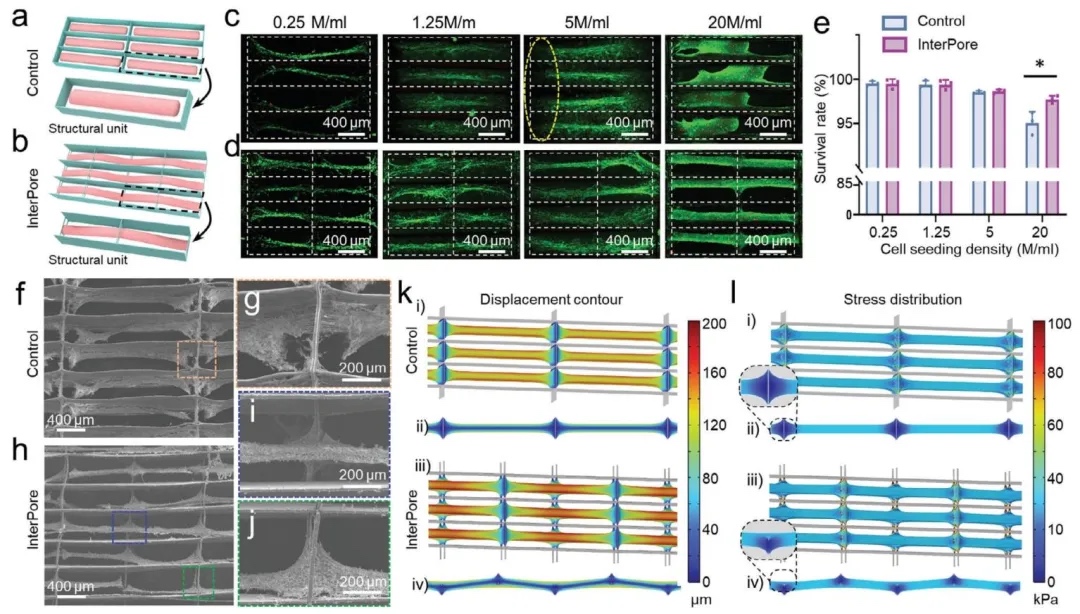 采用细胞培养实验和有限元模拟的方法,对比InterPore微纤维晶格与传统晶格,研究其对组织形成的影响,结果表明InterPore微纤维晶格能促进形成高度排列、紧密且纵向互连性增强的组织,维持高细胞密度和细胞活力。