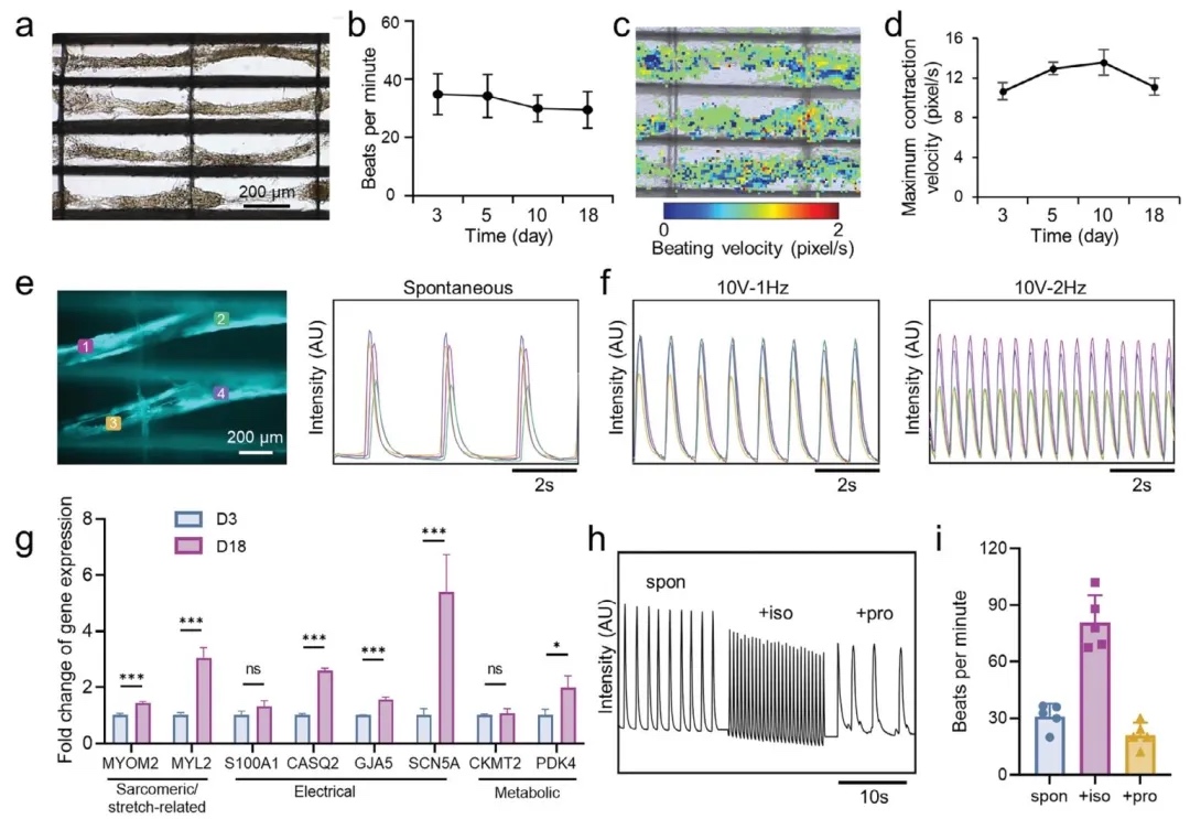 采用细胞培养、钙成像、基因表达分析和药物处理等方法,研究在InterPore微纤维晶格中使用hiPSC-CMs构建功能性人类心脏组织的过程,结果表明该晶格能促进hiPSC-CMs功能成熟,构建的组织对药物有响应,可用于药物测试。