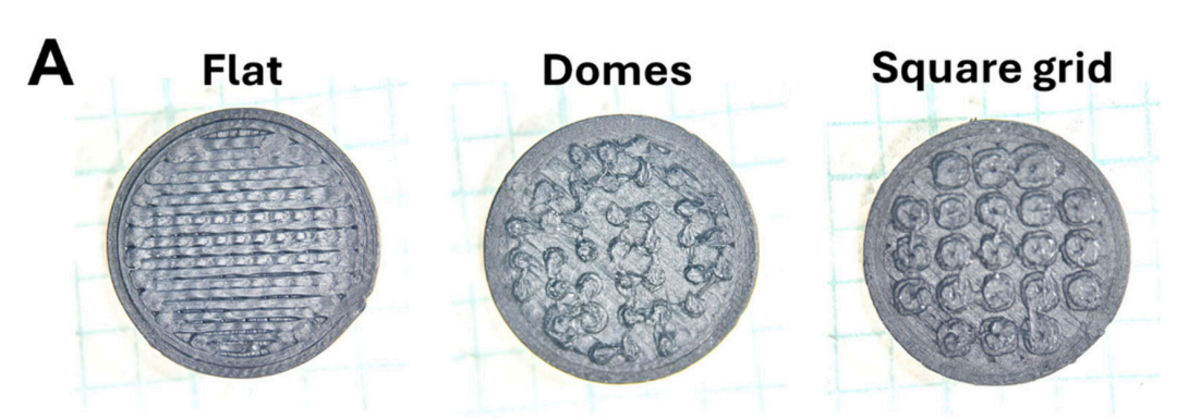 △平面、圆顶和方格 CB/PLA 电极的光学显微镜图像。图片来自布莱顿大学。