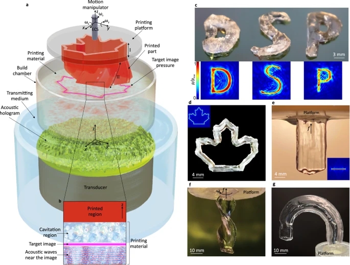 在这些实验中,机械臂负责支撑打印平台,后者悬浮于浸没在水中的传感器上方。构建室被安置在传感器和打印平台之间,并充满了聚合物打印材料。换能器发射高声压声波,这些声波在构建室内触发了一种称为“空化”的声化学反应,该反应产生固体材料。机械臂按照复杂的路径移动打印平台,以构建形状,同时将打印物体垂直拉出构建室,从而形成三维结构。这项研究基于Habibi先前的工作,即利用声波进行直接声音打印(DSP)。相关技术涉及将聚焦的超声波施加到产生空化的聚合物上,以实现3D打印结构的生成。