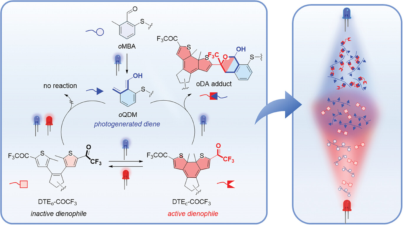 △示意图介绍了一种拮抗双色光化学反应策略,通过利用光调制的氧代-狄尔斯-阿尔德反应,在光笼二烯和光开关亲二烯体之间控制聚合物网络的形成。