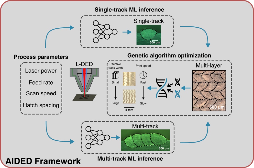 增材制造,尤其是激光金属增材制造,因其能够制造复杂形状的部件而备受关注。然而,工艺参数的优化一直是该领域的一大挑战。传统的工艺优化方法通常依赖于耗时的试错过程,且难以同时满足多个优化目标。尽管模拟技术有所进展,但其计算资源需求大,难以在实时工业应用中推广。因此,开发一种快速、准确的工艺优化方法成为了推动增材制造技术广泛应用的关键。Accurate Inverse process optimization framework in laser Directed Energy Deposition (AIDED) 框架的创新研究团队提出的AIDED框架结合了机器学习模型和遗传算法,能够快速、准确地预测单道、多道和多层熔池的几何形状,并通过逆向优化直接从用户指定的优化目标中识别出最佳工艺参数。