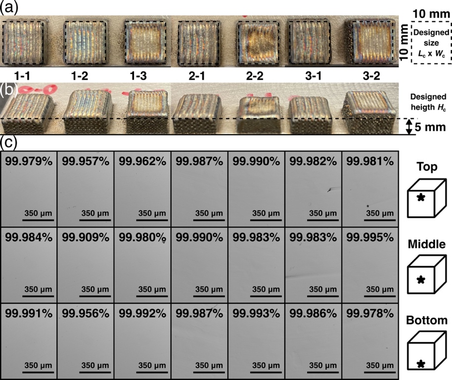 研究团队通过实验验证了AIDED框架的有效性,成功解决了多目标优化问题,识别出在保证高打印速度和小有效轨道宽度情况下的最佳工艺参数。实验结果表明,使用AIDED框架优化的打印件密度超过99.9%,且打印速度显著提升。例如,在打印一个10