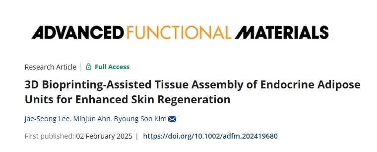 Kim教授团队开发了一种快速组织打印方法,通过流变学和计算分析优化聚己内酯(PCL)框架,在0.3秒内挤出负载前脂肪细胞的生物墨水构建脂肪单元。针对前脂肪细胞迁移抑制脂滴形成的问题,团队研制出限制细胞迁移、促进脂肪细胞成熟的混合生物墨水,并计算出最佳脂肪单元直径(≤600μm)。此外,团队将脂肪模块与真皮模块整合,验证其内分泌功能。相关工作以“3D