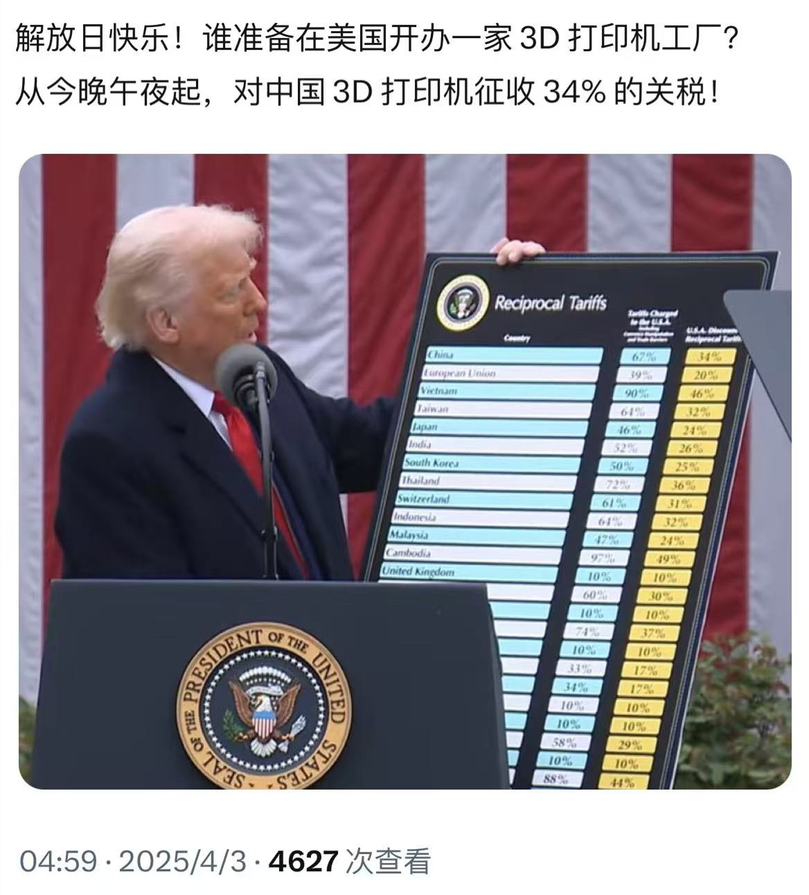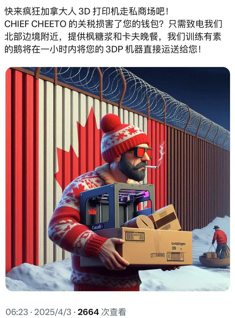 另外,有拓竹3D打印机在美国的代理商向南极熊表示,“每次涨关税,厂商都会通知美国所有零售商立刻涨价,最近的两次涨关税,3D打印机价格也涨了至少两次了。这次加征34%关税,应该很快也会收到厂商的涨价通知。不过,现在全中国还处于清明节假期,大家都放假了。”现在这个世界,太乱了!“危机中蕴藏机遇,风暴中才能诞生强者”。关税动荡,谁将是3D打印机的王者?