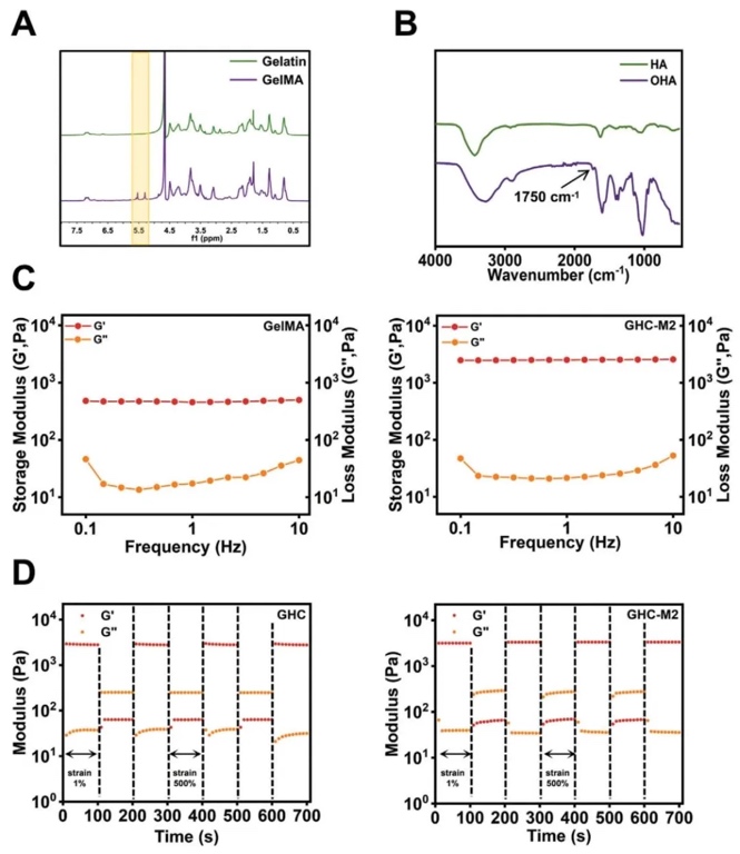 通过化学合成、光谱分析、物理性能测试等研究方法,研究了由GelMA、OHA、CMCS和MPC组成的GHCM生物墨水及水凝胶。结果表明,该生物墨水在4°C混合后发生溶胶