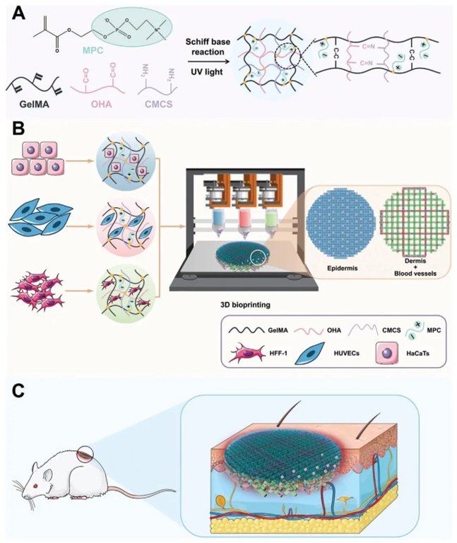 中国科学院苏州纳米技术与纳米仿生研究所的黄洁研究员团队开发了一种新型离子导电仿生生物墨水(GHCM),并利用3D生物打印技术制备双层导电皮肤支架用于全层皮肤缺损治疗。该生物墨水由明胶甲基丙烯酸酯(GelMA)、氧化透明质酸(OHA)、羧甲基壳聚糖(CMCS)和2-甲基丙烯酰氧乙基磷酰胆碱(MPC)组成,解决了传统导电水凝胶的诸多问题。相关工作以