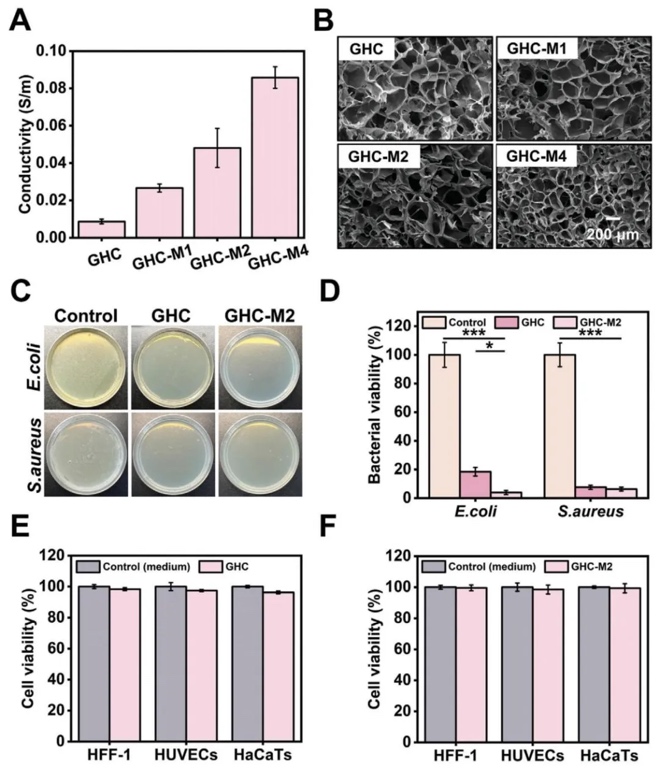 10Hz频率范围内远大于损耗模量,完全交联后储能模量值约3kPa,与天然皮肤相当。同时,水凝胶具有良好的自愈合性、导电性、抗菌性和生物相容性,MPC的添加显著提高了水凝胶的离子电导率,且GHC
