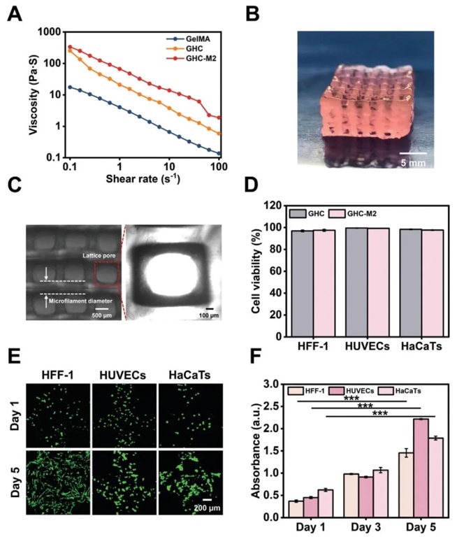 采用流变测试、打印实验、细胞活性检测等研究方法,研究了GHCM生物墨水在3D打印中的性能。结果显示,OHA和CMCS的加入提高了生物墨水的粘度,MPC的掺杂进一步增强了该性能,GHC