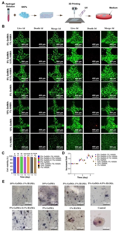 采用细胞活力染色、细胞增殖检测及碱性磷酸酶(AP)染色等方法,研究3D打印过程及不同多组分水凝胶对SKPs增殖和活性的影响。结果显示,3D打印后第1天,SKPs在多组分水凝胶中活力超95%,第3天虽略有下降但仍超90%,且各水凝胶组中SKPs均有不同程度增殖;AP染色表明多组分水凝胶未影响SKPs毛囊再生潜能,5%