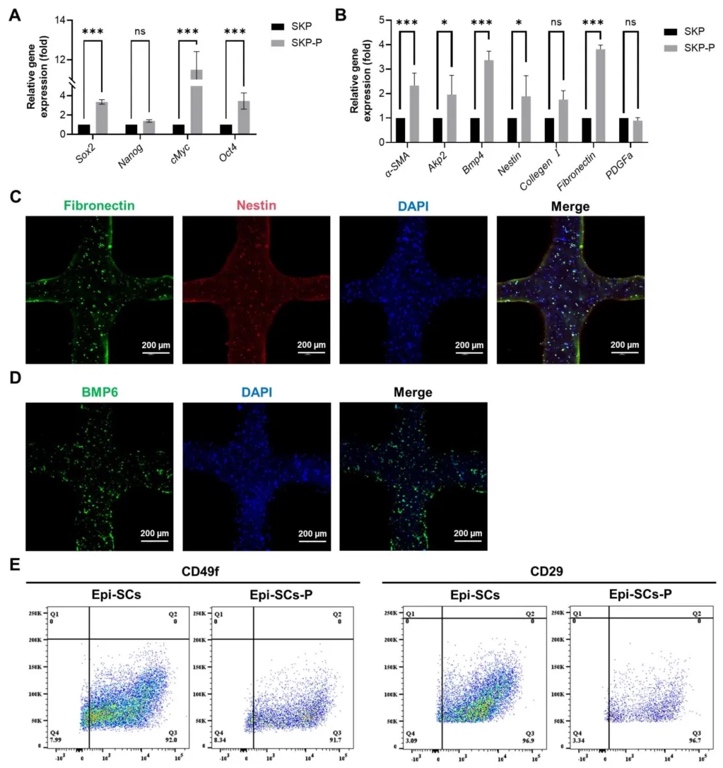 qPCR)和流式细胞术分析,研究3D打印和三维培养对SKPs细胞特性、干性及毛囊诱导潜能的影响,以及多组分水凝胶对Epi -