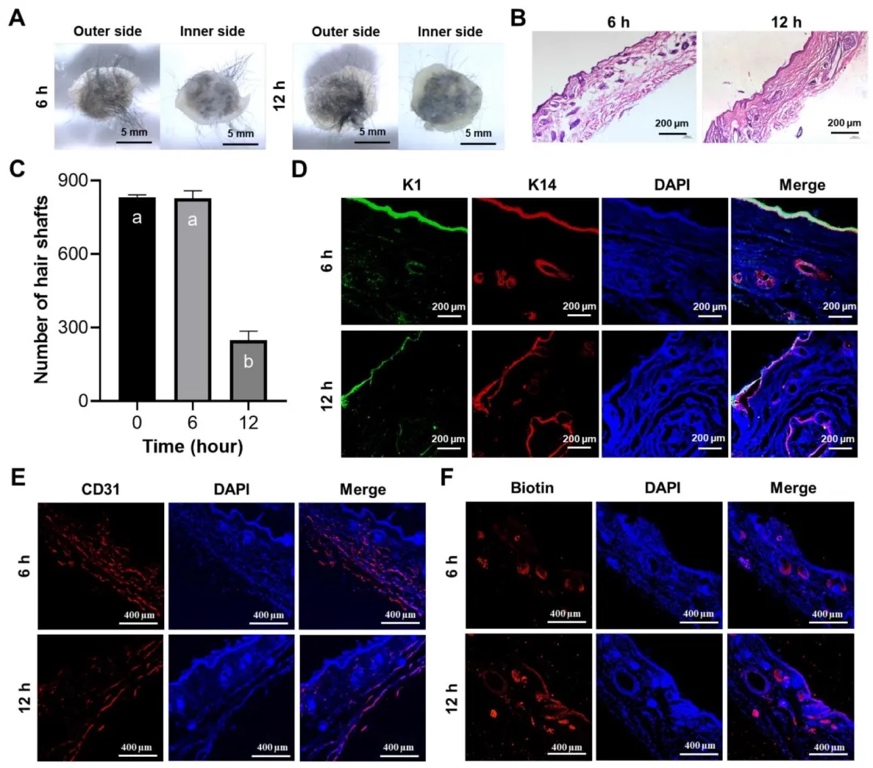 h后移植到裸鼠伤口,通过观察毛发再生情况、H&E染色、免疫荧光染色和毛发数量统计,研究预制人工皮肤的再生能力。结果表明,体外培养6和12