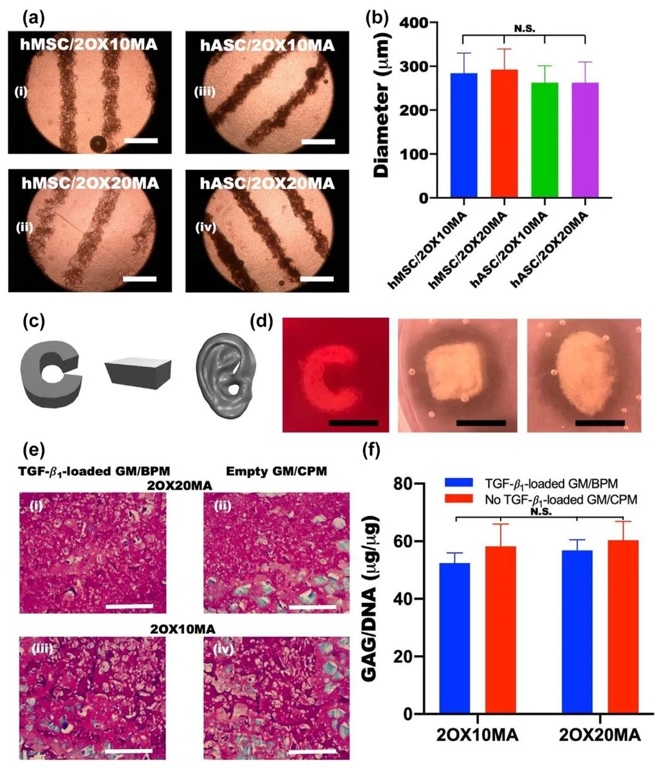5. 通过3D打印基于细胞聚集体的生物墨水并进行软骨分化实验,研究该生物墨水的打印性能和软骨形成能力。结果表明,该生物墨水打印的结构具有高分辨率和形状保真度,经软骨分化后能形成软骨组织,与阳性对照组无显著差异,验证了其在组织工程中的应用潜力。