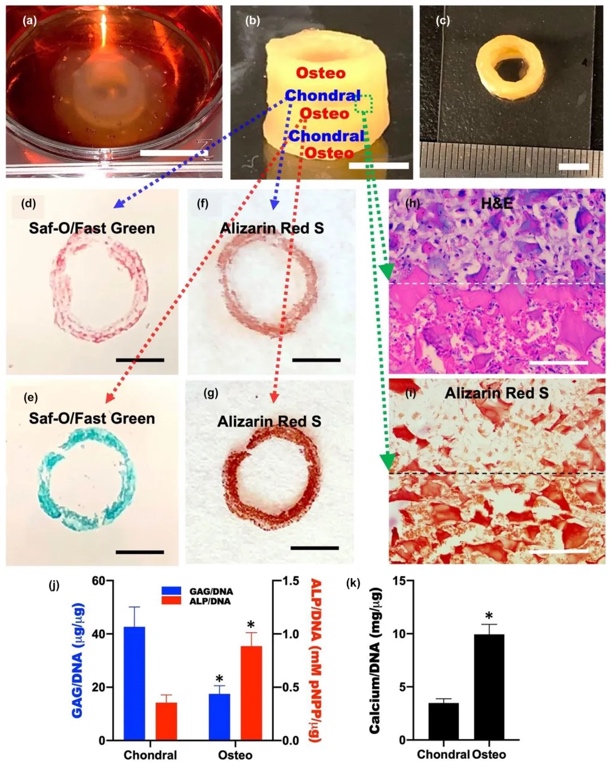4. 通过交替打印成骨和软骨生物墨水构建管状结构,并进行组织学染色和成分分析,研究多相组织的形成情况。结果显示,成功构建出由软骨和骨组织组成的多相骨软骨组织,且各组织区域的成分和功能符合预期,证明了利用该生物墨水构建多相组织的可行性。