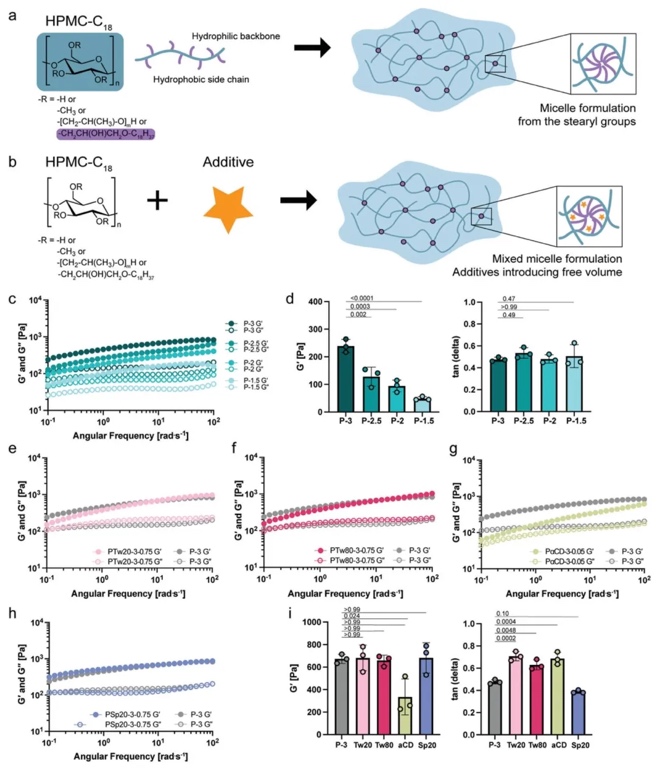 Appel教授团队通过将疏水改性的纤维素聚合物与表面活性剂或环糊精等添加剂混合,制备出具有高延展性的物理交联水凝胶生物墨水。该团队系统研究了添加剂对水凝胶流变性能的影响,并通过3D打印实验验证了高延展性水凝胶在高速打印中的优势。相关工作以“Highly