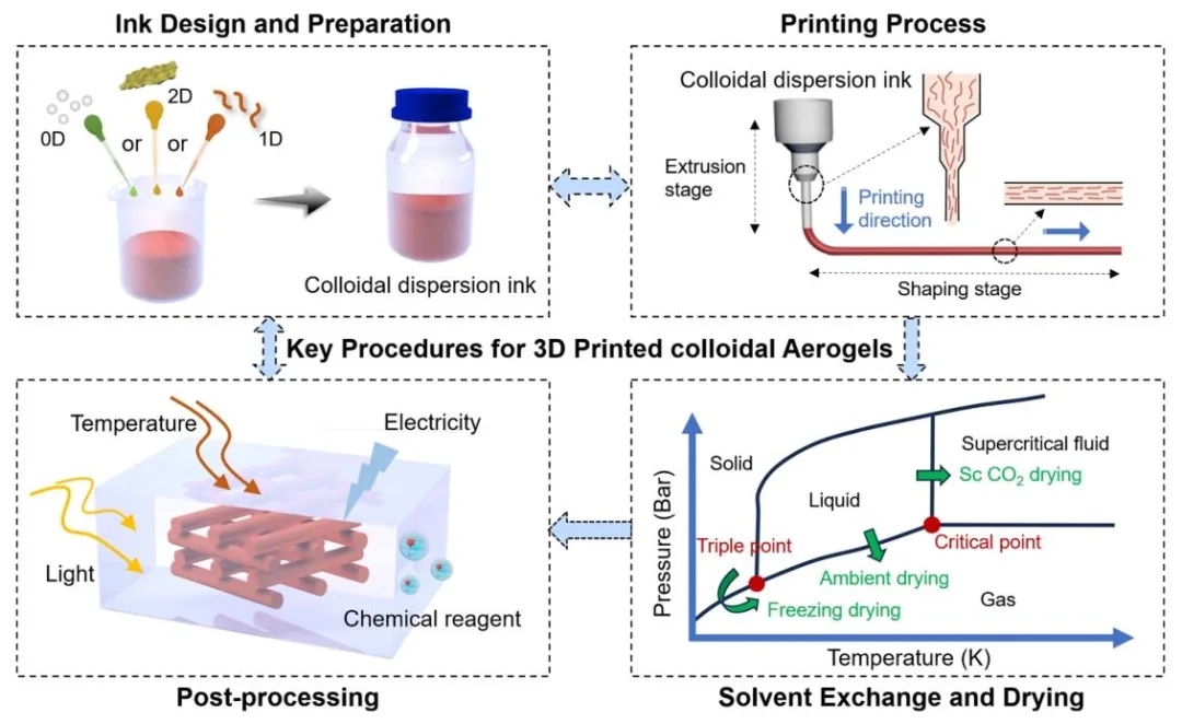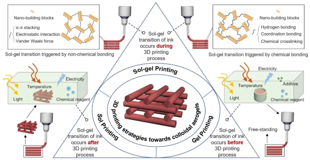 凝胶/凝胶打印策略和限域功能化进行了详细阐述。团队提出通过开发新的打印技术、优化墨水配方、改进打印设备等措施,有望解决当前3D打印胶体气凝胶面临的如打印速度慢、多组分打印困难等问题,为该领域的发展提供了新的思路和方向。相关工作以“3D