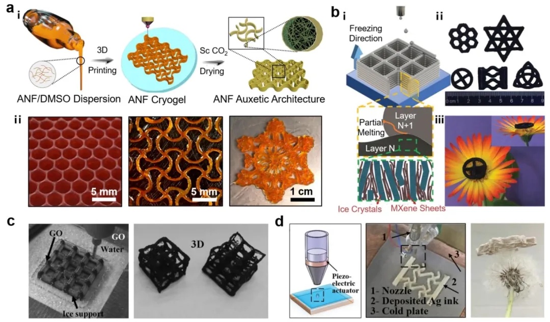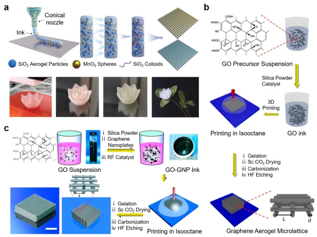 - 制备流程:通过实验研究和流程分析,明确3D打印胶体气凝胶的制备包含墨水设计与制备、打印过程、溶剂交换和干燥以及后处理等关键步骤。墨水需考虑纳米构建块种类等因素;打印有喷墨、挤出、光固化等方式;干燥方法影响气凝胶结构;后处理可优化气凝胶性能。