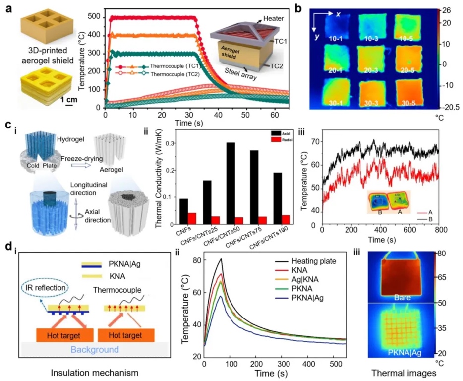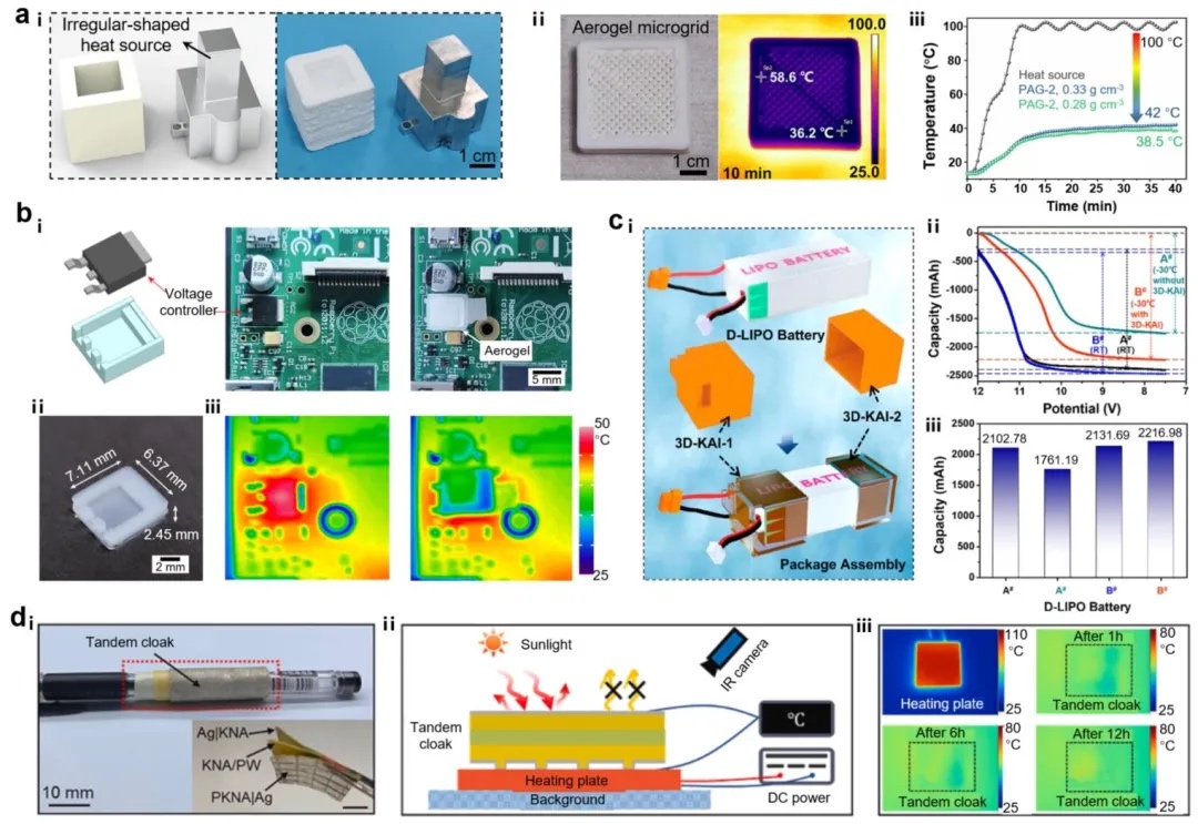- 热管理:以3D打印的二氧化硅基和Kevlar基胶体气凝胶为例,研究其在热管理领域的应用,如作为隔热材料和用于红外隐身。结果表明它们能有效阻挡热量传递和控制红外辐射。