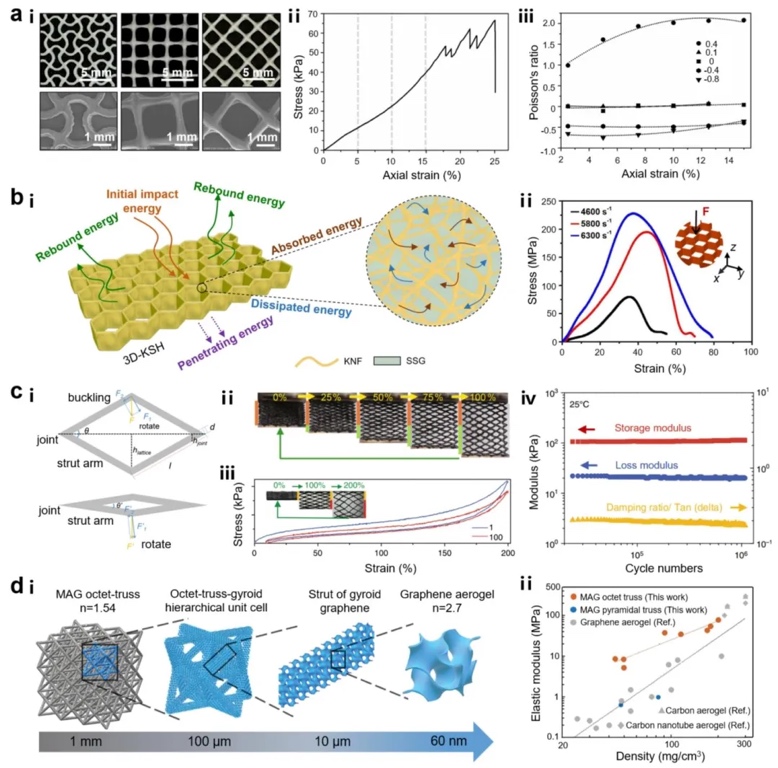 - 机械性能:以Kevlar、石墨烯/CNT等胶体气凝胶为研究对象,通过力学测试和结构分析,发现可通过设计气凝胶的层次结构调控其机械性能。如Kevlar胶体气凝胶可获得负泊松比,石墨烯/CNT胶体气凝胶能实现高拉伸比和高疲劳抗性。