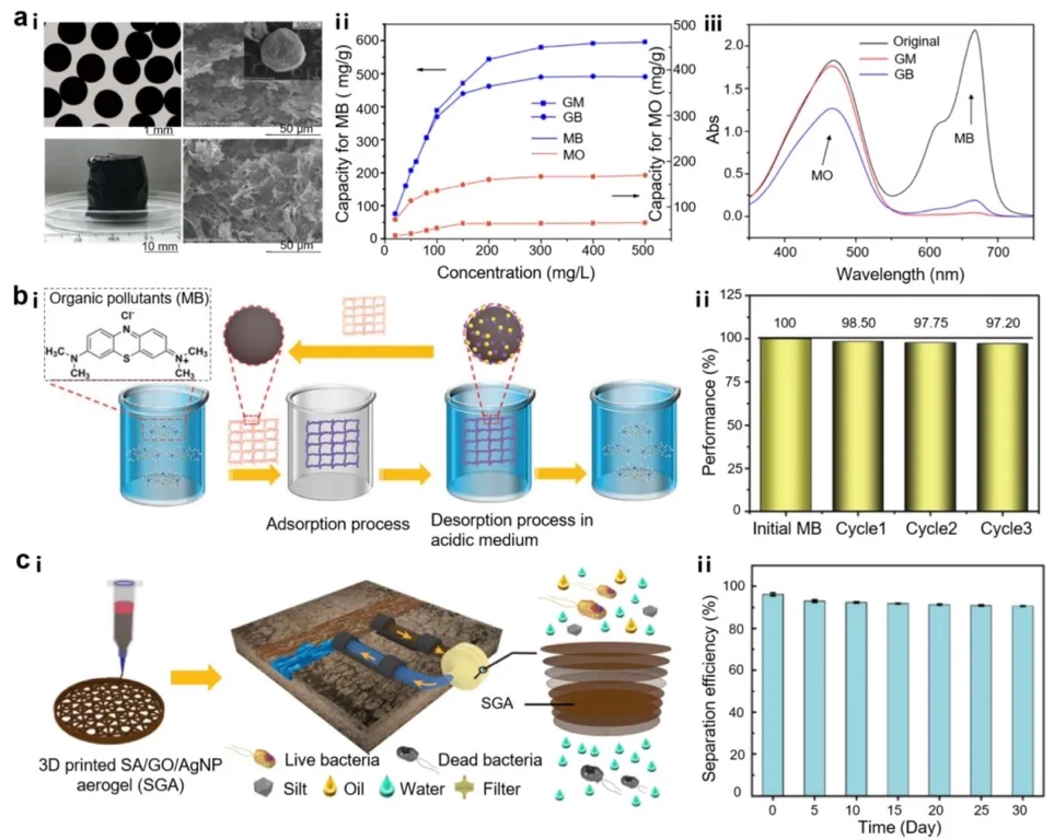 - 吸附性能:利用吸附实验和吸附模型分析,研究3D打印胶体气凝胶对多种物质的吸附能力和吸附机制。结果表明其对染料、有机污染物等有良好吸附能力,如3D打印的石墨烯微球对亚甲基蓝的吸附性能优异。