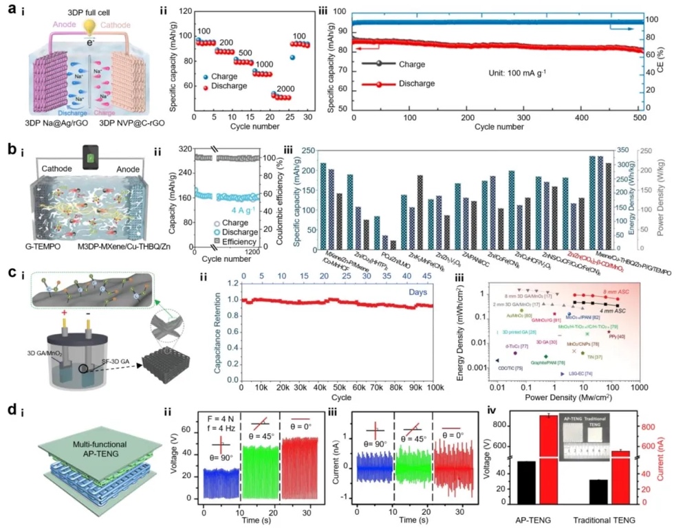 - 能源存储:通过实例展示和性能分析,研究发现3D打印胶体气凝胶可用于组装多种电化学器件,如钠金属电池、锌离子电池、超级电容器和摩擦纳米发电机等,能提高能源存储和转换效率。