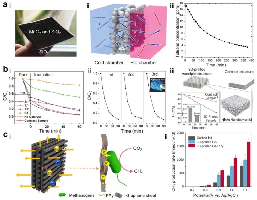 - 催化:通过实验研究,发现3D打印胶体气凝胶与功能材料结合可实现对有机化合物的光热催化降解、二氧化碳转化等。如3D打印的二氧化硅基双层胶体混合气凝胶可用于甲苯的光热催化降解。