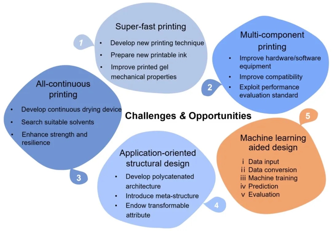 分析3D打印胶体气凝胶当前面临的挑战,包括超快速打印、多组分打印、全连续打印、面向应用的结构设计和机器学习辅助设计等方面。通过对现有技术和应用需求的研究,提出相应的解决方向和未来发展机遇。