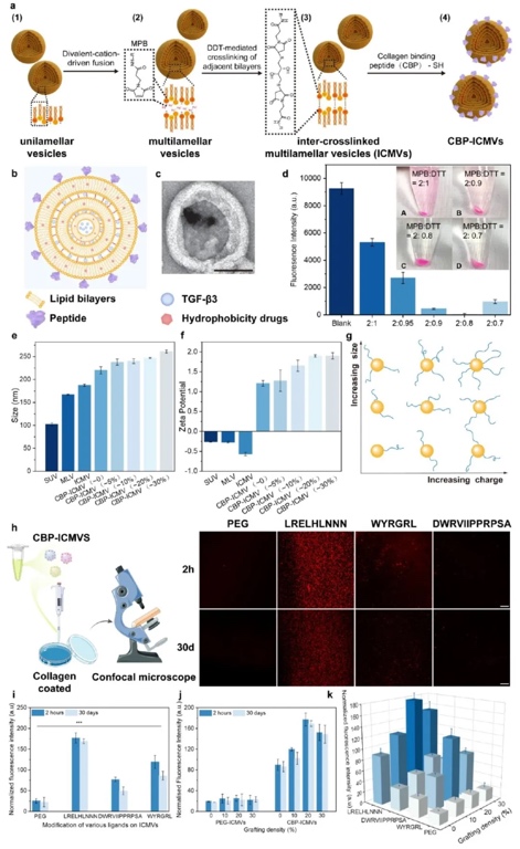 CBP-ICMVs的合成及物理表征:通过化学合成、透射电镜(TEM)、动态光散射(DLS)、ζ电位测定等方法,研究CBP-ICMVs的合成过程、结构、粒径、表面电荷以及不同肽修饰对其结合能力的影响。结果表明,成功合成CBP-ICMVs,其粒径随合成步骤逐渐增大,ζ电位变化证实了肽的成功共轭;不同肽修饰的ICMVs对胶原蛋白的结合能力不同,LRELHLNNN修饰的ICMVs结合能力最强,且20%的修饰密度时效果最佳。