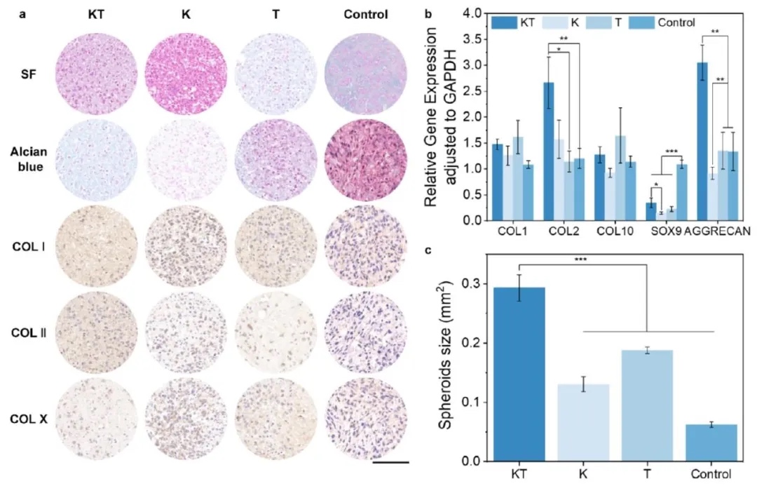 CBP-ICMVs负载KGN和TGF-β3促进MSCs体外向透明软骨分化:利用细胞培养、细胞化学染色、免疫细胞化学染色、RT-qPCR等技术,以人脂肪来源的间充质干细胞(hADSCs)为研究对象,探究CBP-ICMVs负载KGN和TGF-β3对MSCs向透明软骨分化的影响。结果显示,CBP-ICMVs负载KGN和TGF-β3的实验组(KT组),在细胞化学染色中产生更多的糖胺聚糖分泌,免疫细胞化学染色中II型胶原蛋白表达最高,RT-qPCR分析表明该组增强了软骨生成相关基因的表达,促进了MSCs向透明软骨分化。