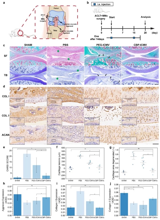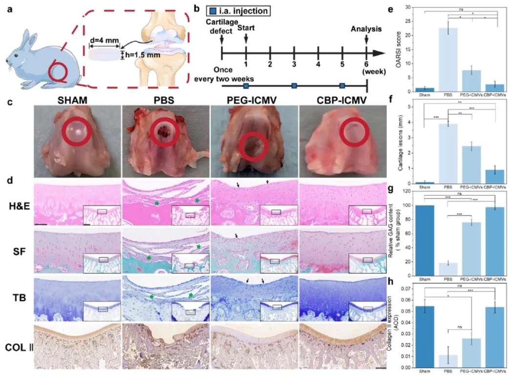 II、Aggrecan)、OARSI评分等方法,研究CBP-ICMVs对早期OA的治疗效果。结果表明,与PEG-ICMVs组相比,CBP-ICMVs组的软骨损伤明显改善,软骨表面更光滑,Col