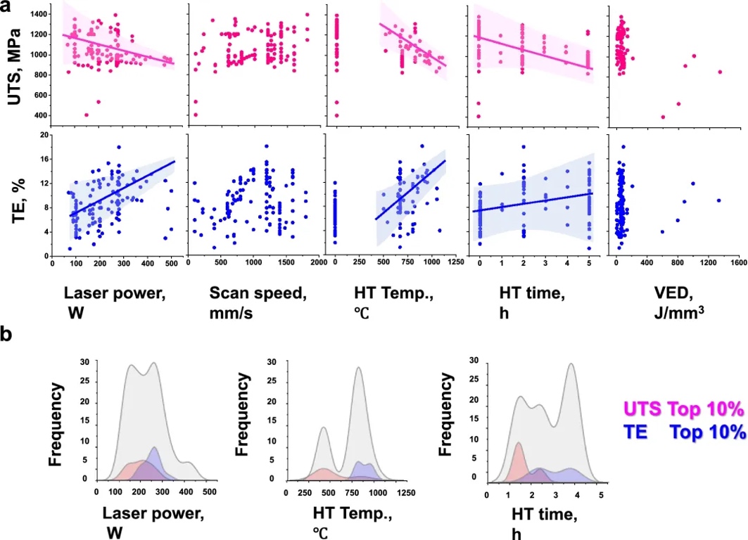 296 个候选参数构成的庞大参数空间,精准确定能够同时提高强度和延展性的最优参数。与先前研究中的 Ti-6Al-4V