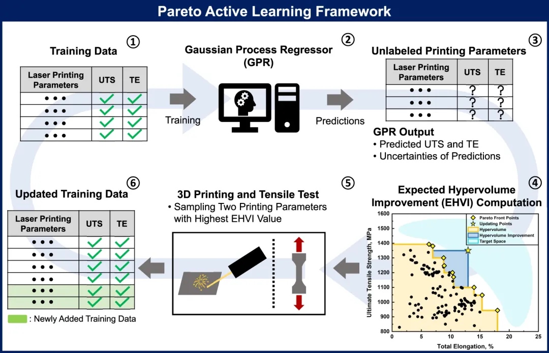 科研人员设计出 Pareto 主动学习框架,旨在突破传统单目标优化的局限,同时对极限抗拉强度,也就是 UTS,以及总延伸率,即 TE,进行优化。
