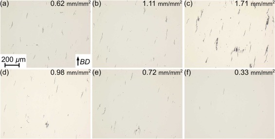 毫米、(e)0.5 毫米和 (f) 0.2 毫米的样品的光学显微镜(OM) 图像。所有图像的比例与 (a) 中所示相同,裂纹密度(单位为