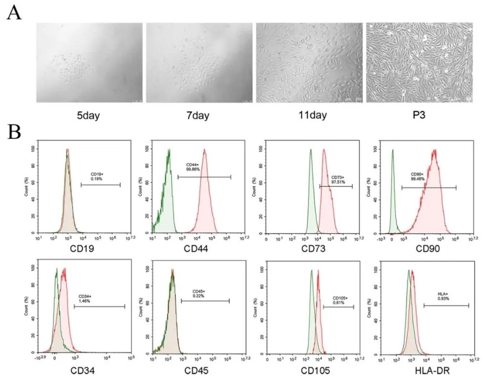 通过对健康男性尿液样本进行离心、培养等处理获取hUSCs,运用流式细胞术对其表面抗原进行鉴定,并使用特定诱导培养基进行成骨、成脂分化诱导,再通过茜素红和油红O染色来评估分化情况。结果显示,hUSCs呈现梭形形态,高表达CD44、CD73和CD90等干细胞相关抗原,且能成功分化为成骨细胞和脂肪细胞,具备多向分化潜能。
