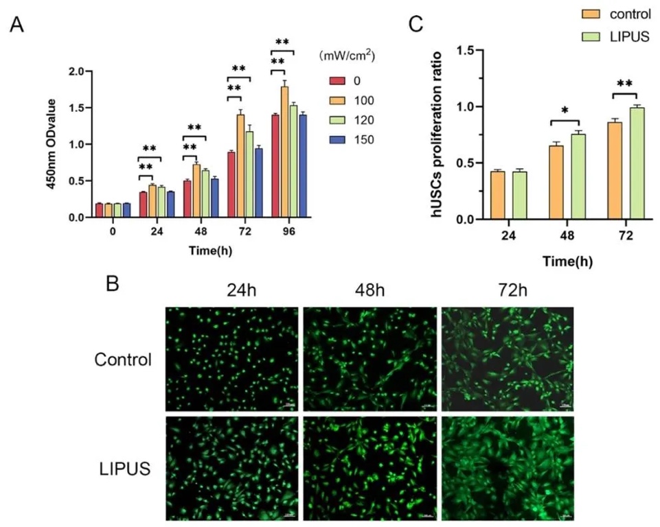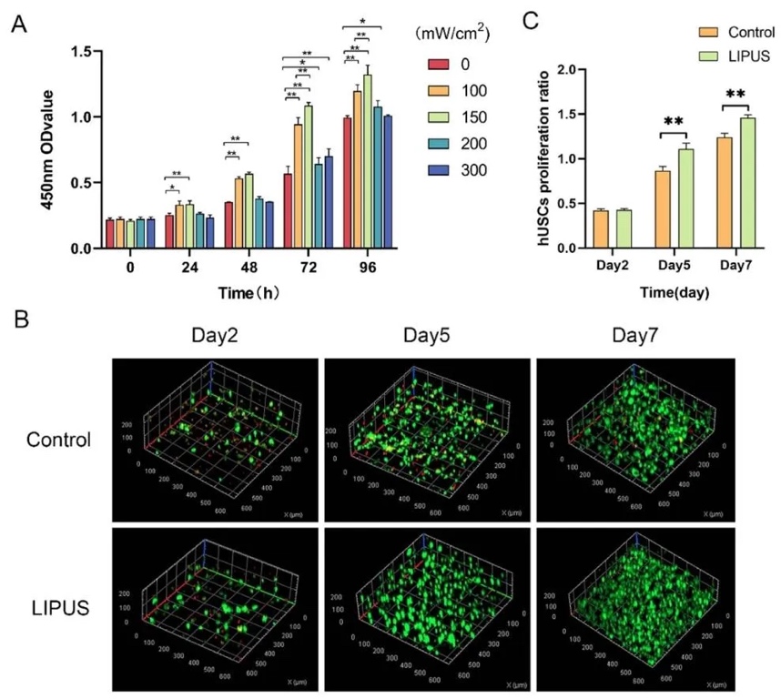8检测和活/死染色技术,在不同时间点评估细胞增殖情况。结果表明,在一定范围内,LIPUS能促进hUSCs增殖,其中100 mW/cm^2