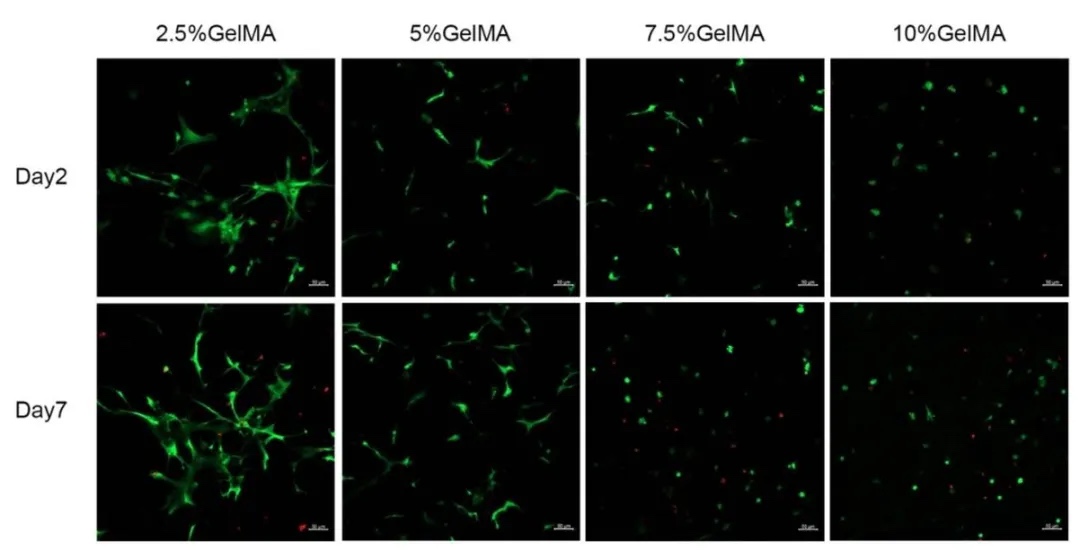 制备不同浓度(2.5%、5%、7.5%、10%)的GelMA生物支架,将hUSCs接种其中,通过活/死染色在不同时间点观察细胞生长情况。结果显示,2.5%